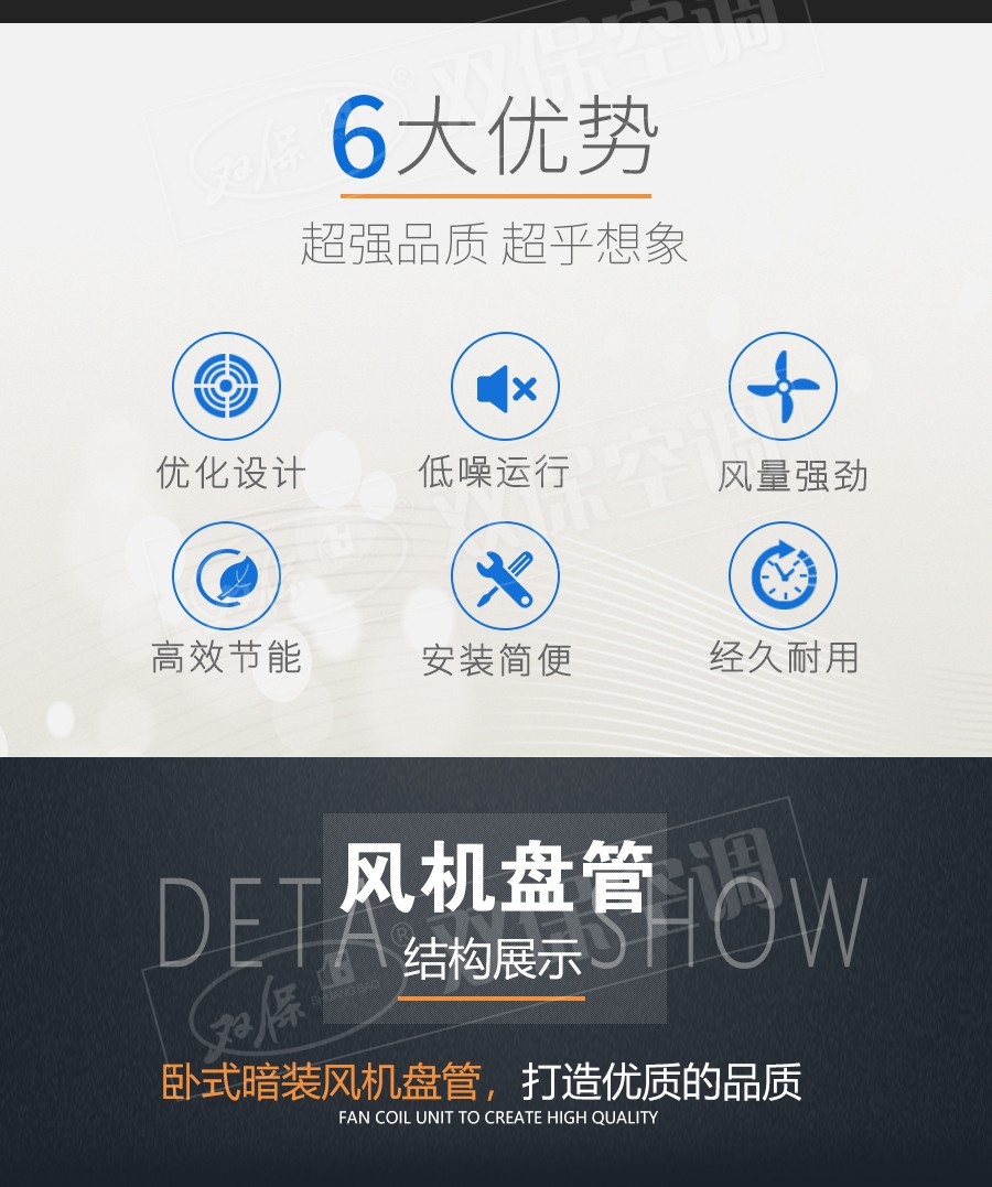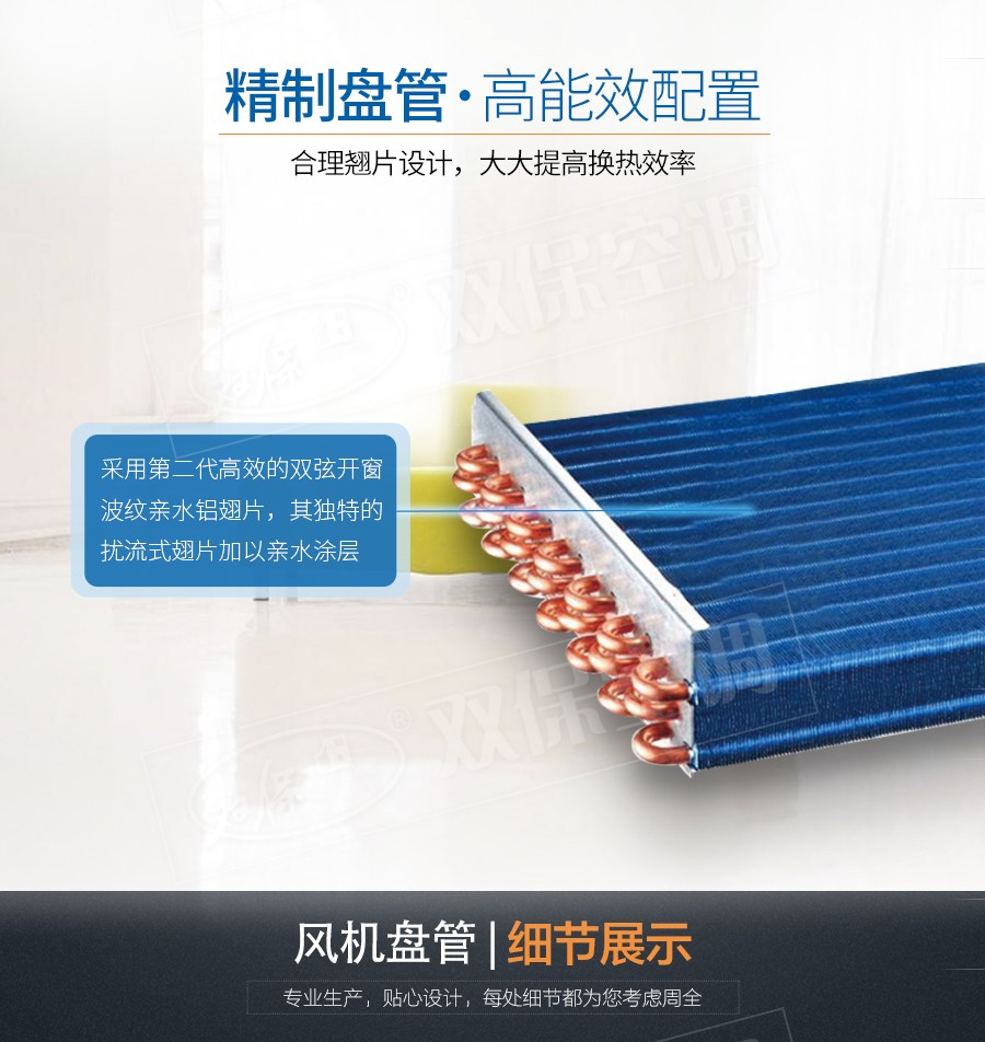 江蘇雙保空調有限公司—臥式暗裝風機盤管是中央空調理想的末端產品,其工作原理是機組內不斷的再循環所在房間或室外的空氣,使空氣通過冷水(熱水)盤管后被冷卻(加熱),以保持房間溫度的恒定。雙保風機盤管采用優質薄壁無縫紫銅管與親水鋁翅片,經液壓或機械漲管而成,傳熱系數高,韌性好,強度大,可承受高水壓,可以在超高層建筑使用。