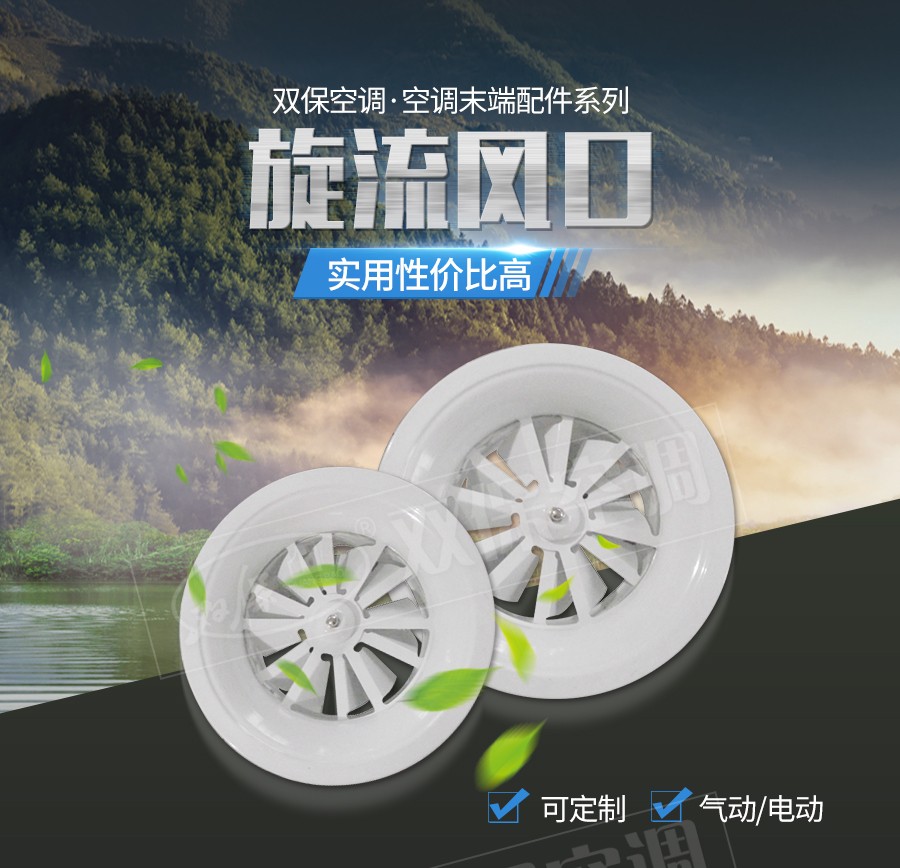 江蘇雙保空調有限公司—旋流風口用于高大空間送風,射程遠。常用于頂送風,可電動或手動調節送風風量。面板為冷軋鍍鋅鋼板,散流圈為深拉沖壓鋁制件,表面為純白色(RAL9010)漆。